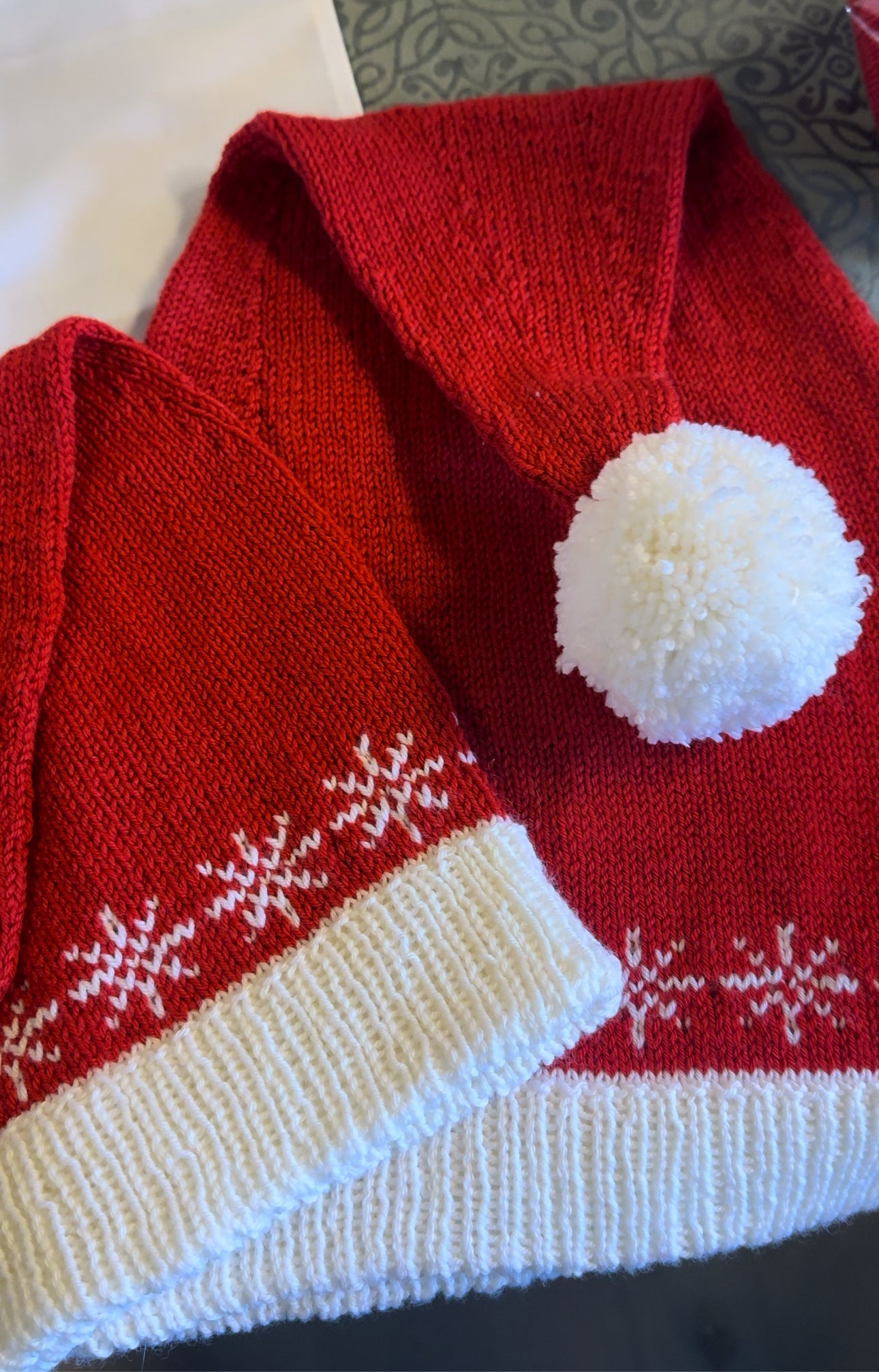 Snefnug Nissehue er strikket i Saphior’s Merino garn. Nissehuen har en hvid kant i rib, som ligger dobbelt, og derefter strikkes huen rundt i glat strik. Et simpelt mønster skaber snefnug langs huens kant. Indtagningerne i toppen giver huen sin karakteristiske nissehueform. Afslutningsvis kan der tilføjes en pompon eller kvast for et ekstra fint touch.